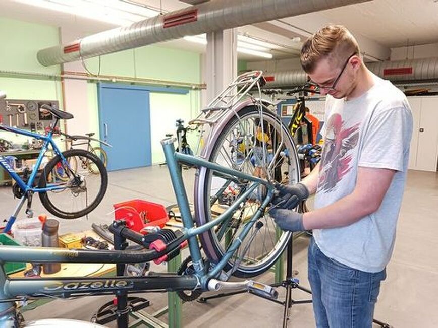 Er ist Gruppen-Leiter für die Velo Fahrrad-Werkstatt.